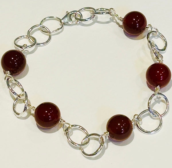 A radiant bracelet featuring warm carnelian gemstones interlinked with polished silver rings — a perfect balance of energy and elegance.