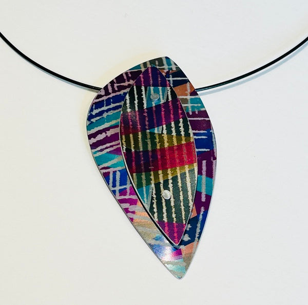 Individually coloured and laser etched anodised aluminium; Slim Oval Pendant from Mandy Nash's new collection of Tone & Line Anodised Aluminium.
