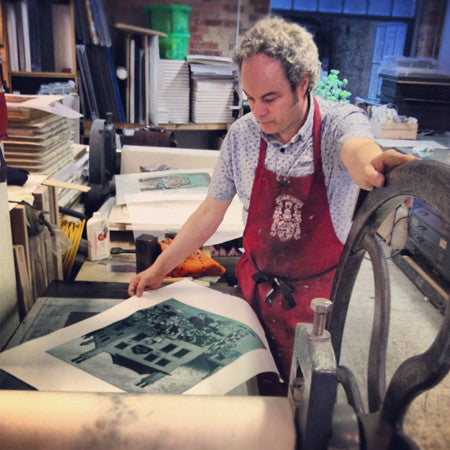 Mychael has been working as a printmaker since 1991 and amongst his achievements has written and had published his own book on intaglio printmaking. He is a narrative artist who illustrates incidents from everday life – his sense of humour being evidenced throughout his prints and paintings. He has produced a unique series of Artists’ Dogs and Cat etchings – which are proving to be quite popular and resulting in sell-out editions. As Mychael’s work becomes more sought after we are pleased that he continues to add new prints to this great, fun series of prints and that we also have the opportunity of exhibiting and selling some of his original paintings alongside our other artists’ work.