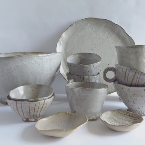 Olilvia hand buils a range of fine stoneware functional items with each piece being constructed from slabs of clay and stroked into its individual shape. This process leaves the marks of her making - for example - finger marks and the palmar creases of hands - visible to show the story of her process on the finished surface.