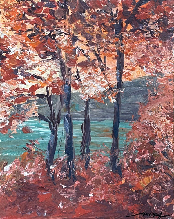 "Gathering of Four" A Painting that is clad in rich autumnal hues. Trees standing as sentinels of seasons, takes centre stage in this evocative composition.