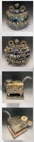 I have recently retired from 27 years in secondary education as a teacher and faculty head and it is now time to resolve some unfinished business with clay… I am of the view that my ceramics and the way in which I work is strongly influenced by belonging to a generation that made things as children. My approach to ceramic processes is akin to the analogy of a kid in a sweet shop, I want to try as many methods as possible and produce work using earthenware, stoneware, Raku and other alternative firing techniques. I have an ongoing interest in how a fairly limited range of shapes can be combined in a number of different formats to create variations in overall form but recently I have been experimenting with the possibilities of surface decoration by piping or icing thick slip onto my pots.