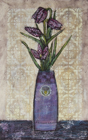 Vicky’s strong images are created using Collagraphs – which are created using an experimental form of printmaking. The prints are taken from plates which have been collaged with a variety of materials: card, fabric, paper, string, sand and anything else that Vicky may decide to use. The plates are then sealed, inked up and printed in intaglio or relief on damp paper using an etching press. The embossed textural quality of the print is unique to this method. Thanks to the process itself, Vicky is able to make small editions of the image. The editions are variable due to the process and her desire to experiment, which means each of Vicky's prints are unique.